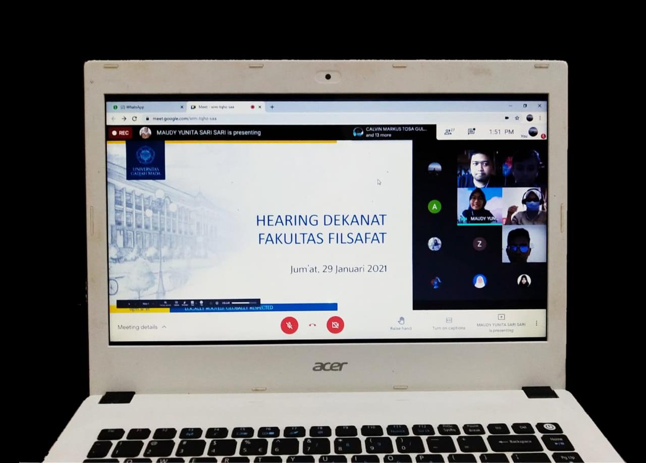 Menjelang keberlangsungan semester genap tahun ajaran 2020/2021, Lembaga Mahasiswa Fakultas Filsafat (LMFF) berupaya mengeskalasi isu terkait kebijakan selama pandemi dengan mengadakan forum Hearing Dekanat yang diadakan secara daring melalui video conference Google Meet pada Jumat (29/1). Forum ini dihadiri langsung oleh Arqom Kuswanjono, selaku Dekan Fakultas Filsafat; Siti Murtiningsih, selaku Wakil Dekan Bidang Akademik dan kemahasiswaan; Agus Himmawan Utomo, selaku Wakil Dekan Keuangan Aset dan SDM; Septiana Dwiputri Maharani, selaku Wakil Dekan Penelitian, Pengabdian, Kerjasama, dan Alumni; Sonjoruri Budiani Trisakti, selaku Kepala Program Studi S1; Darmono, selaku Kepala Seksi Akademik dan Kemahasiswaan; dan Zainal Mustofa selaku kepala Kantor Administrasi. Forum ini memfokuskan untuk mempertemukan titik terang atas kritik, keluhan, dan aspirasi dari mahasiswa Fakultas Filsafat kepada Dekanat.